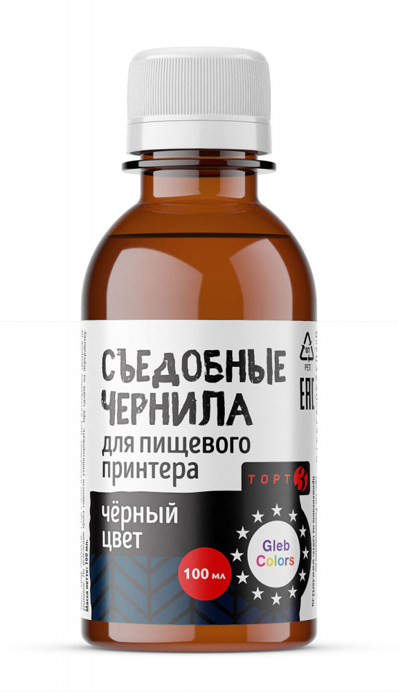Пищевые чернила Торт3. Чёрный цвет больше всего расходуется в пищевом принтере, поэтому многим клиентам удобнее покупать дополнительно чёрные пищевые чернила. Хватит на 10 заправок.
