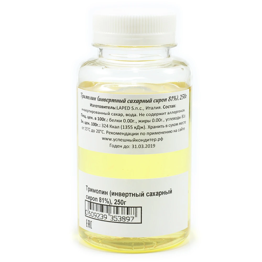 Тримолин это инвертный сахарный сироп, состоящий из глюкозы и фруктозы в равных количествах, значительно более сладкий, чем сахар, имеет коэффициент сладости 125.